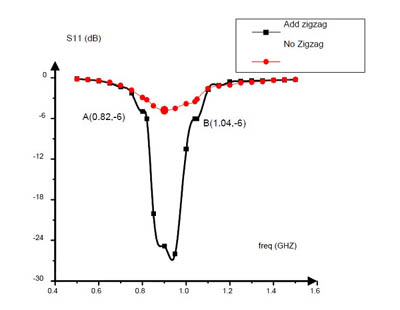Since the bad performance is caused by the incomplete image, a complementary method can be employed to solve this problem. A piece of antenna is attached to the other end of the ground plane to complete the image. The ultilization of the zigzag antenna is because of its small size.