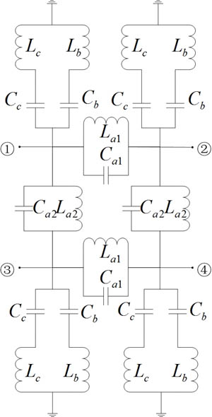 For the purpose of analyzing the mechanism of this dual band quadrature hybrid, a lumped elements model was built up, and the values of each parameters in the below figure are extracted.